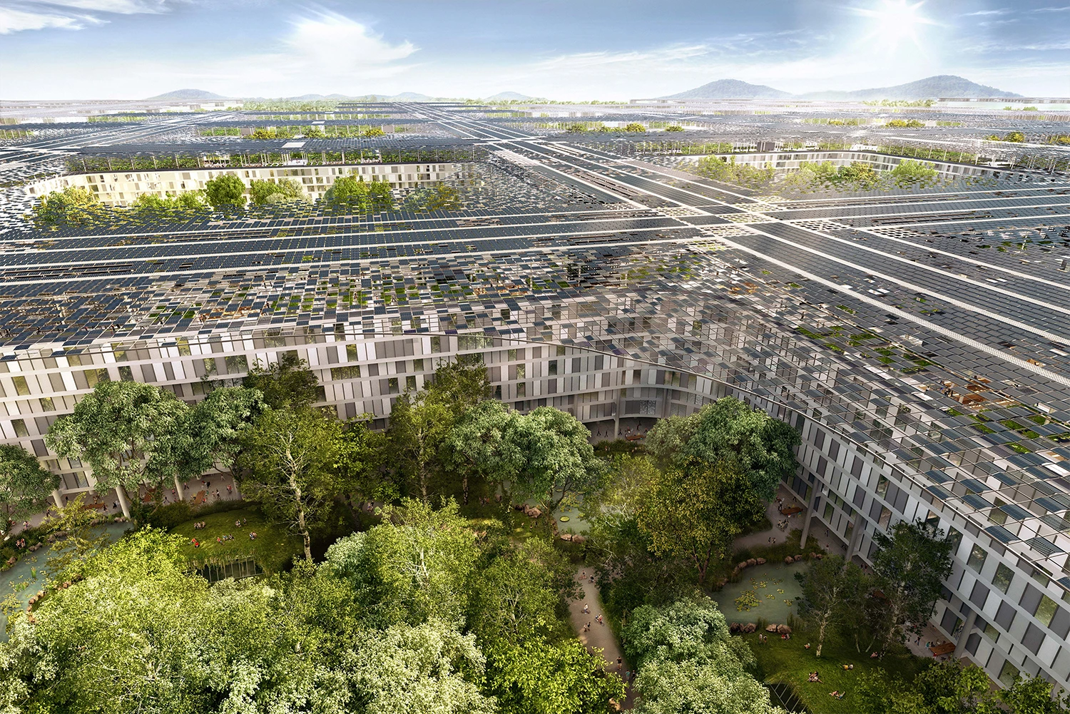 Building bridge connectors allow podium-level movement.The roof is reserved for energy and food production.