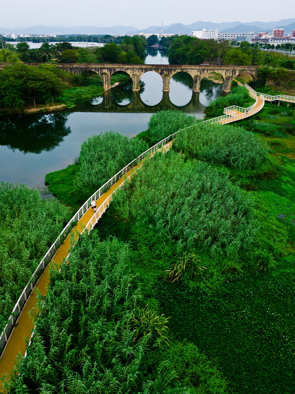 Beijing firm Turenscape has restored the heavily polluted Puyangjiang River in eastern China and turned its banks into an alluring park, crisscrossed by an elevated network of colourful sinuous boardwalks.