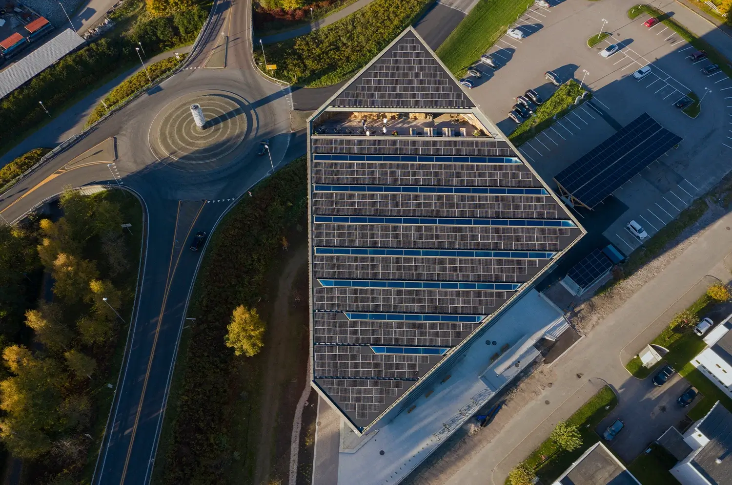 The building’s striking 24° tilted roof gently slopes to surpass the extremities of the building’s volume, expanding the roof’s surface and ensuring a maximum amount of solar energy can be harvested both from the photovoltaic canopy and the building’s PV-cell clad south-facing facade.A performative approach, says Kjetil, may lead to unconventional aesthetics. And these out-of-the-box buildings sometimes face criticism for the way they look.